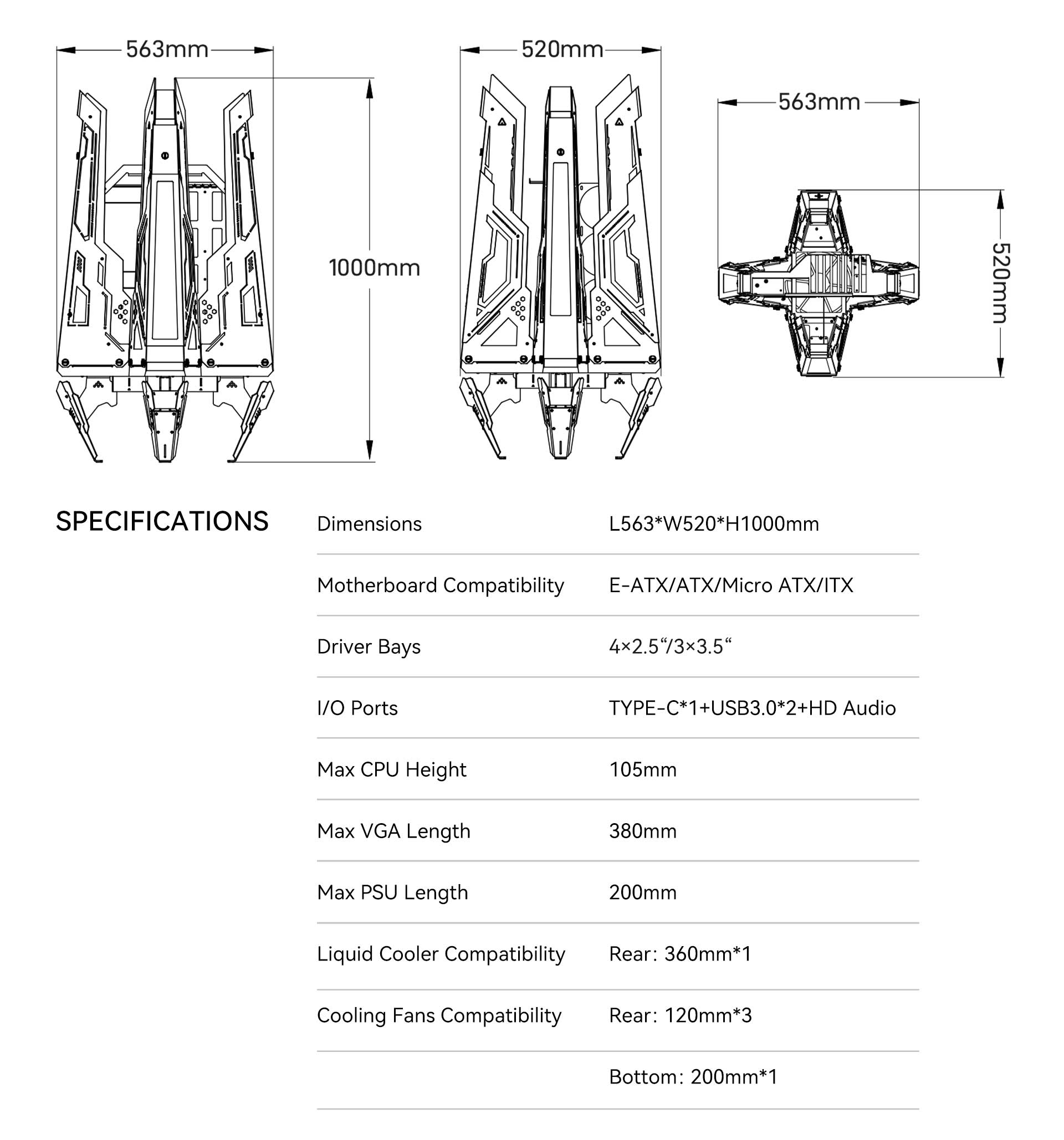 | I/O Ports | TYPE-C*1+USB3.0*2+HD Audio | Cooling Fans Compatibility | Rear:120mm*3 Bottom:200mm*1 |